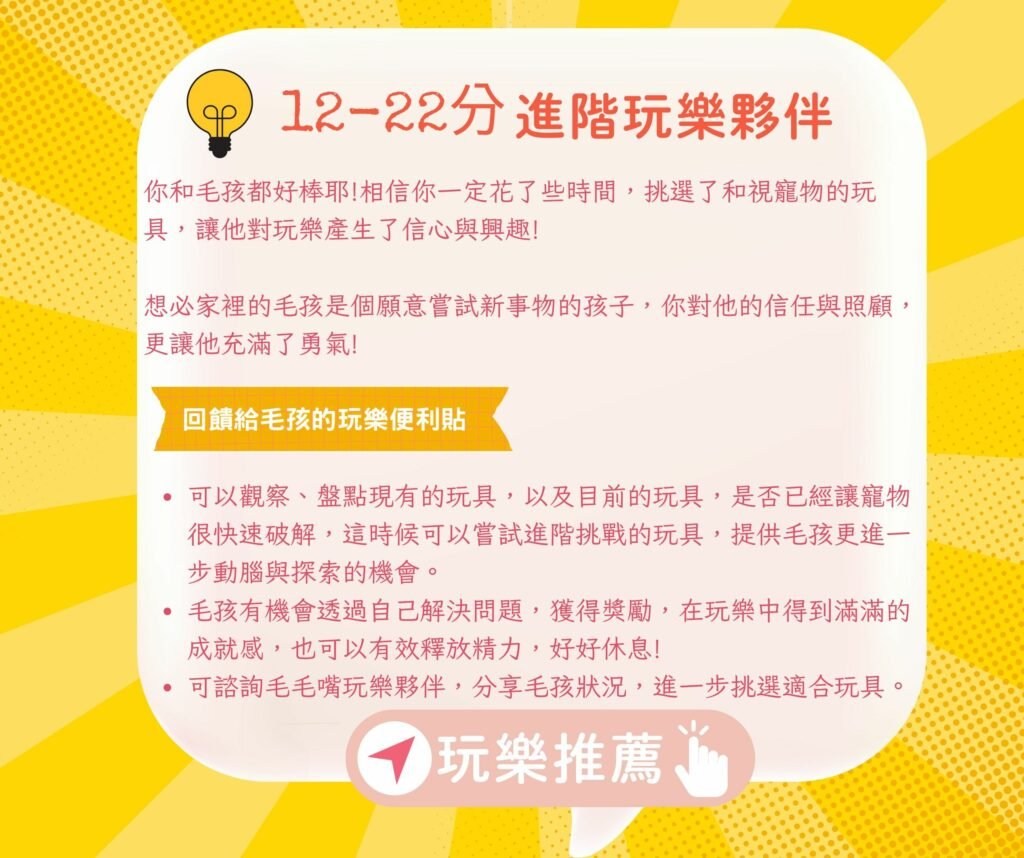 右上角左邊的就是得分(小提醒:分數高低主要依照所提供的觀察填答了解毛孩現階段狀態,以便我們進一步給與毛孩更合適的玩樂方案)