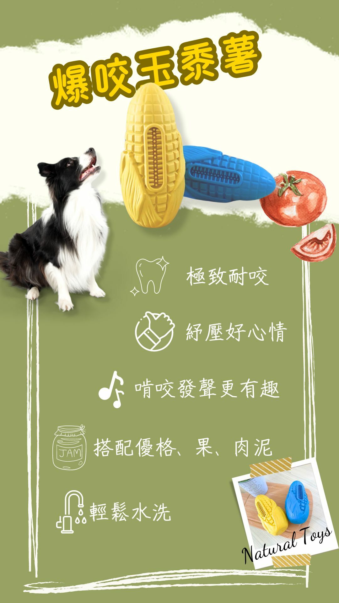 • 高硬度與厚實耐咬: 爆咬玉蜀黍專為高強度啃咬者設計。其一體成形的堅固材質,提供了足夠的硬度與韌性,能夠承受狗狗長時間的強力啃咬,有效消耗精力。
